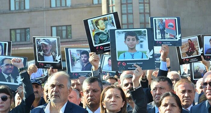 Ulus’ta bir araya gelen yüzlerce kişi, üzerinde katledilen 103 kişinin fotoğraflarının olduğu ’10 Ekim Ankara katliamını unutturmayacağız’ pankartı açtı.Anmaya katliamda yaşamını yitirenlerin yakınları, Ankara ve Suruç katliamlarından yaralı kurtulanlar, 10 Ekim Mitingi’ni düzenleyen KESK, DİSK, TMMOB ve TTB başkanları, HDP Eş Genel Başkanı Sezai Temelli ve HDP milletvekilleri Saruhan Oluç, Filiz Kerestecioğlu, Murat Çepni, Musa Piroğlu, Oya Ersoy, Serpil Kemalbay, CHP Grup Başkanvekili Özgür Özel ve Genel Başkan Yardımcıları Yıldırım Kaya, Veli Ağbaba, Orhan Sarıbal, Onursal Adıgüzel ile bazı CHP milletvekilleri de katıldı.Ulus’tan katliamın yaşandığı Ankara Garı’na doğru yürüyüşe geçen yüzlerce kişi, ’10 Ekim’i unutma unutturma’, ‘Savaşa hayır barış hemen şimdi’, ‘Katil devlet hesap verecek’, ‘Faşizme karşı omuz omuza’ sloganlarını attı.