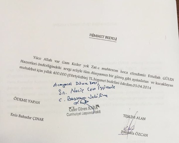 AKP Afyonkarahisar Milletvekili Ali Özkaya, twitter hesabından bir kağıt paylaştı. Boş bir A4 kağıdının üstüne “himmet bedeli” yazılmış. Altına da bir albayın ismi ve karşısına Mustafa Özcan’ın ismi yazılmış. Belgenin üzerine Cafer Güven Kara ve Cem Necip İşçimen isimli iki savcı, isimlerini koyarak A4 kağıdına ciddiyet kazandırmaya çalışsa da, belgenin komikliği her yerinden anlaşılıyor.