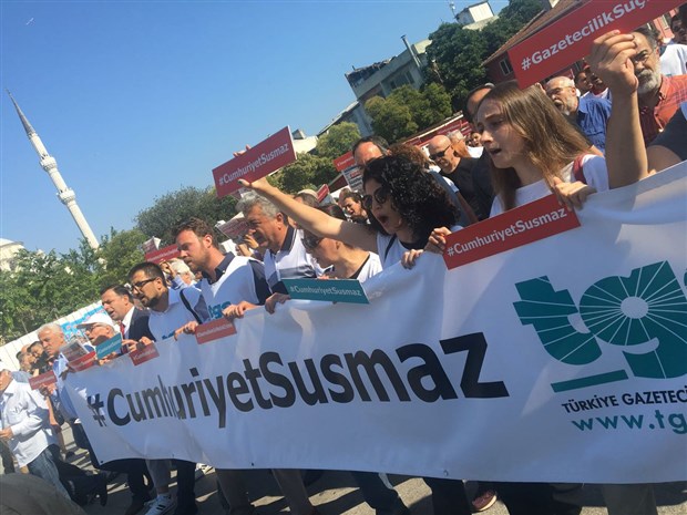 “Terör örgütüne üye olmamakla birlikte örgüt adına suç işlemek” iddiasıyla tutuklanan Cumhuriyet gazetesinin yönetici, yazar ve avukatları hakkındaki dava başladı. Cumhuriyet Vakfı Yönetim Kurulu Başkanı Orhan Erinç, Cumhuriyet Vakfı İcra Kurulu Başkanı Akın Atalay, Cumhuriyet Gazetesi Genel Yayın Yönetmeni Murat Sabuncu, Almanya’da bulunan gazetenin eski yayın yönetmeni Can Dündar, Cumhuriyet Gazetesi Yayın Danışmanı Kadri Gürsel, Cumhuriyet Kitap Eki Yayın Yönetmeni Turhan Günay, gazetenin okur temsilcisi Güray Öz, gazetenin çizeri Musa Kart, Cumhuriyet Vakfı Yönetim Kurulu üyeleri Önder Çelik ve Bülent Utku, Cumhuriyet Vakfı Danışma Kurulu üyesi avukat M. Kemal Güngör, Cumhuriyet muhabiri Ahmet Şık ve gazetenin köşe yazarlarından Hakan Kara, Aydın Engin ile Hikmet Çetinkaya’nın de aralarında bulunduğu 19 kişi hakkında, Türk Ceza Kanunu’ndaki ‘anayasal düzene karşı suçlar’ ve Terörle Mücadele Kanunu’nun ceza artırımını öngören düzenlemesi kapsamında 7,5 yıldan 43 yıla kadar hapis cezaları isteniyor. 24 Temmuz Basın Bayramı’yla aynı güne denk gelen dava 27’nci Ağır Ceza Mahkemesi tarafından görülecek.