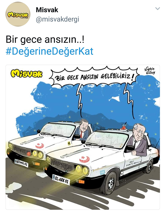 Dergi, Erdoğan ve MHP Lideri Bahçeli’yi ‘Beyaz Torosla’ operasyona çıkarken çizdi. Karikatür’de “Bir gece ansızın gelebiliriz” ifadesi yer alırken Toros model arabalarda 82 Musul ve 83 Kerkük plakaları yer aldı.