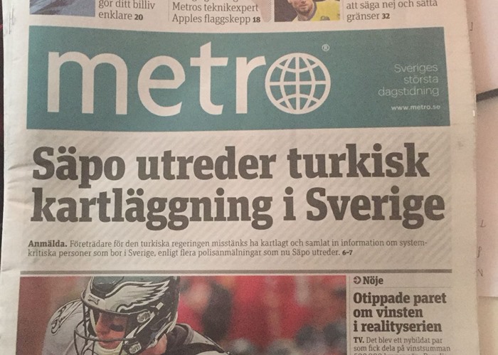 1 milyonu aşkın tirajıyla İsveç’in en büyük ve ücretsiz dağıtılan gazetesi olan Metro da, bugünkü sayısında Säpo’nun Türk yetkililer hakkında “casusluk” suçlamasıyla soruşturma başlattığını ilk sayfasında manşetten duyurdu.Haberde, aralarında İsveç Alevi Federasyonu, İsveç Demokratik Kürt Toplum Merkezi, Stockholm Pomak Enstitüsü, Stockholm Mezopotamya Kültür Derneği, Amara Kürt Kadın Meclisi, Helsingborg Uluslararası Kürt Kadın Derneği, Tavder Aktivite ve Kültür Derneği, Kadın Barış İnisiyatifi ve soykırım karşıtı insan hakları örgütü Kurdocide Watch CHAK’ın da bulunduğu 34 dernek ve kuruluşun eylül ayında yaptığı suç duyurusundan bir bölüme yer veriliyor.