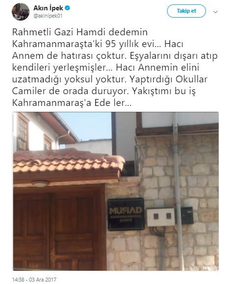 Söz konusu ev Müstakil Sanayici ve İşadamları Derneği (MÜSİAD) hukuksuz birşekilde verildi. Aileye ait eşyalar da dışarı atıldı.Sosyal medya hesabından açıklama yapan İpek, “Rahmetli Gazi Hamdi dedemin Kahramanmaraşta’ki 95 yıllık evi… Hacı Annem de hatırası çoktur. Eşyalarını dışarı atıp kendileri yerleşmişler… Hacı Annemin elini uzatmadığı yoksul yoktur. Yaptırdığı Okullar Camiler de orada duruyor. Yakıştımı bu iş Kahramanmaraş’a Ede ler…(Abi veya kardeş)” dedi.