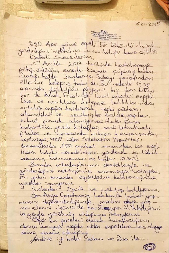 Yaklaşık 7 aydır ‘terör örgütü üyeliği’ iddiasıyla cezaevinde olan görme engelli gazeteci Cüneyt Arat’tan mektup var. “Değerli dostlar, sizlere yine cezaevinden sesleniyorum. Kısa bir mektup oldu ama çok şey sığdırdığıma inaniyorum.Dualarınızda unutmayın lütfen. Allah’a emanet olun. Sevgiler.” dedi.