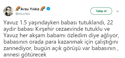 “Yavuz 1.5 yaşındayken babası tutuklandı, 22 aydır babası Kırşehir cezaevinde tutuklu ve Yavuz her akşam babamı özledim diye ağlıyor, babasının orada para kazanmak için çalıştığını zannediyor, bugün açık görüşü var babasının , annesi götürecek.”