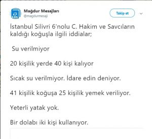Ortalama 20 kişilik koğuşlarda 40 kişi kalırken, 41 kişilik koğuşa 25 kişilik yemek veriliyor.İddialar bununla da sınırlı değil. Kıştan beri sıcak su verilmeyen koğuşlara ‘idare edin’ deniliyor. Yetirli yatağın olmadığı koğuşlarda da bir dolabı iki kişi kullanıyor.İçeriden yaşananlarla ilgili mesajı ise Mağdur Mesajları isimli twitter hesabı yayınladı. İşte o ifadeler;“S.A. bizim mağduriyetimiz diğer insanlardan biraz daha farklı. Silivri 6 nolu cezaevinde hakim ve savcı koğuşlarına su verilmiyor. 20 kişilik koğuşlara 40 kişi doldurdular. Malum yaz geldi, nem zaten maksimum seviyede. Bir de banyo yapma hakları ellerinden alınınca siz düşünün bir de o insanların durumunu. Kış mevsiminden beri sıcak su verilmiyor. Sebebi sorulunca idaren edin deniliyor. Nasıl idare edecekler? Ayrıca 41 kişilik koğuşa 25 kişilik yemek geliyor. Ramazan ayı gelmekte ve bu insanlar oruç tutacak. Bu nasıl vicdan yine sebep sorulduğunda aranızda paylaşın idaren edin deniyor. Kişi sayısı fazla olduğu için yatak yetmiyor ve bazı kişiler yerde yatıyor. Giysi dolapları aynı şekilde iki kişi bir dolap kullanıyor. Ne olur sesimize ses olun, insan su ile imtihan edilmez. Bu insanlar zaten haksız yere…”