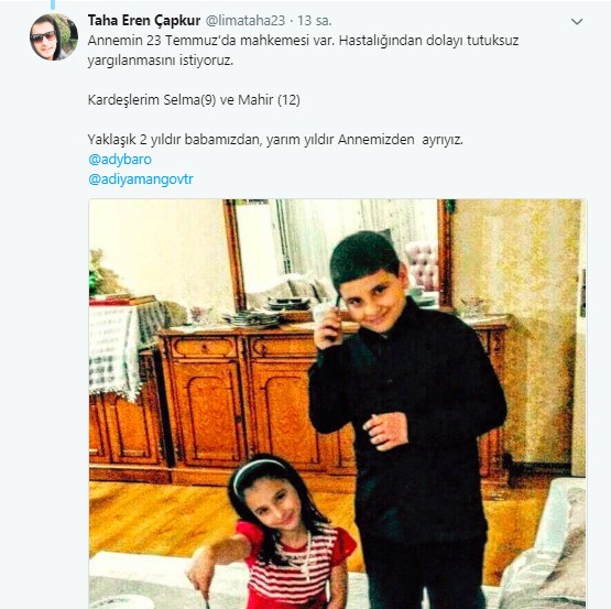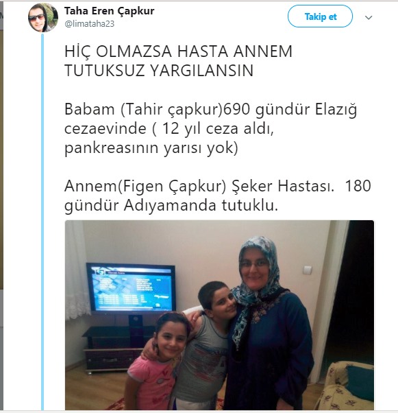 “Hiç olmazsa hasta annem tutuksuz yargılansız” diyen Çapkur, “Babam (Tahir çapkur)690 gündür Elazığ cezaevinde ( 12 yıl ceza aldı, pankreasının yarısı yok) Annem(Figen Çapkur) Şeker Hastası. 180 gündür Adıyamanda tutuklu. Annemin 23 Temmuz’da mahkemesi var. Hastalığından dolayı tutuksuz yargılanmasını istiyoruz. Kardeşlerim Selma(9) ve Mahir (12).Yaklaşık 2 yıldır babamızdan, yarım yıldır Annemizden ayrıyız.” dedi.