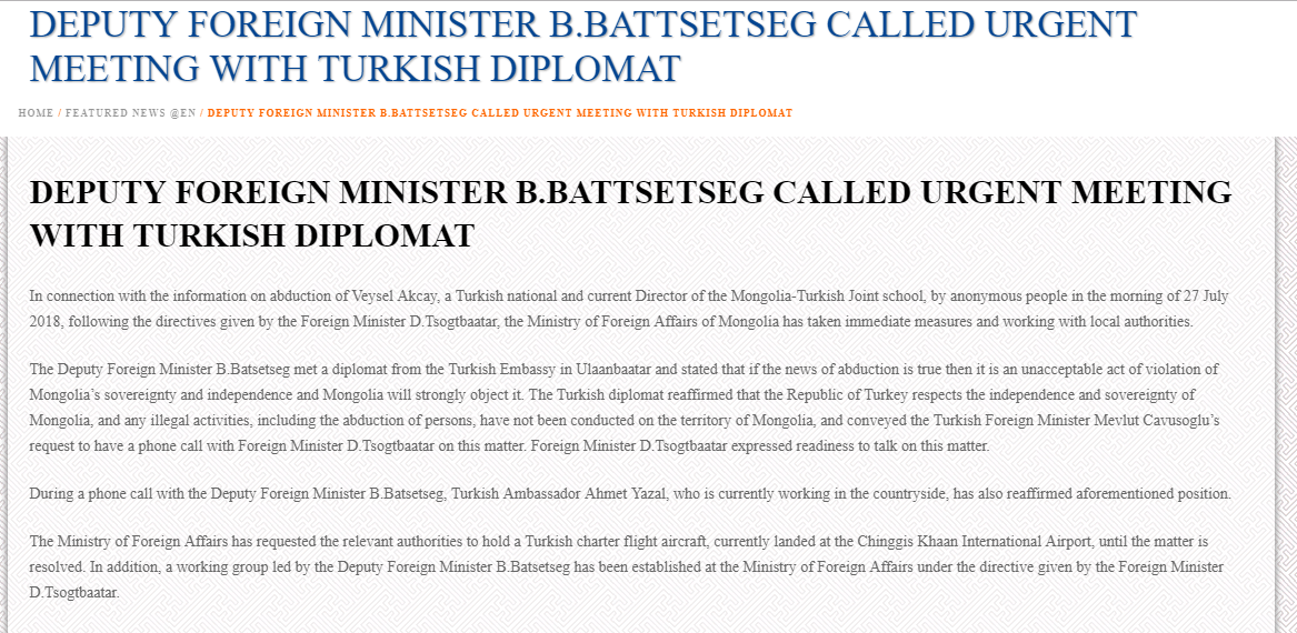 Görüşme sonrası Moğolistan Dışişleri Bakanlığı’ndan yapılan resmi açıklamada şöyle denildi:“Moğol-Türk Okulları Müdürü Veysel Akçay’ın kimliği belirsiz kişiler tarafından 27 Temmuz 2018 sabahı kaçırılmasına ilişkin gelen bilgiler üzerine Dışişleri Bakanı D. Tsotgtbaatar’ın direktifleri doğrultusunda, Dışişleri bakanlığımız gerekli tedbirleri almış ve yerel yetkililer ile temasa geçmiştir.”
