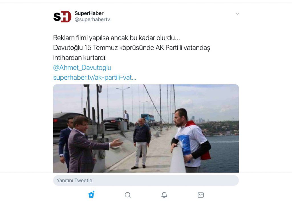 Davutoğlu’nun görüntülerine ise yandaş medya sert eleştiri getirdi. ‘Reklam filmi yapılsa ancak bu kadar olurdu’ başlıkları atan yandaş medya, geçmişti Erdoğan başta olmak üzere köprüden AKP’lilerin intihar olaylarına müdahale etmesini gündeme getirmedi.