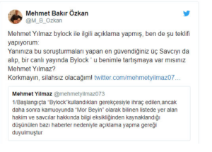 Özkan paylaşımında, “Mehmet Yılmaz bylock ile ilgili açıklama yapmış, ben de şu teklifi yapıyorum: ‘Yanınıza bu soruşturmaları yapan en güvendiğiniz üç Savcıyı da alıp, bir canlı yayında Bylock’u benimle tartışmaya var mısınız Mehmet Yılmaz? Korkmayın, silahsız olacağım!” dedi.