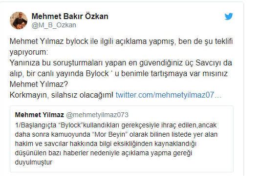 Özkan paylaşımında, “Mehmet Yılmaz bylock ile ilgili açıklama yapmış, ben de şu teklifi yapıyorum: ‘Yanınıza bu soruşturmaları yapan en güvendiğiniz üç Savcıyı da alıp, bir canlı yayında Bylock’u benimle tartışmaya var mısınız Mehmet Yılmaz? Korkmayın, silahsız olacağım!” dedi.