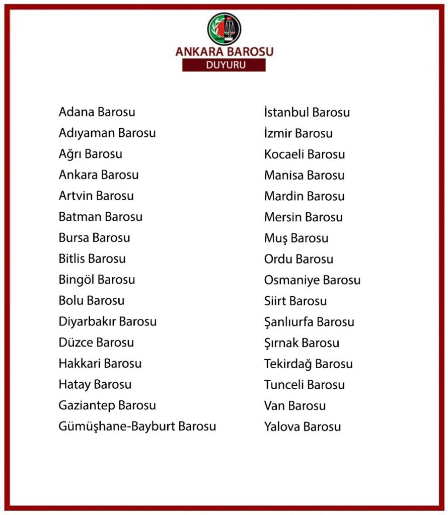 Aralarında Adana Barosu, Adıyaman Barosu, Ağrı Barosu, Amasya Barosu, Ankara Barosu, Artvin Barosu, Batman Barosu, Bolu Barosu, Bursa Barosu, Bitlis Barosu, Bingöl Barosu, Diyarbakır Barosu, Düzce Barosu, Hakkari Barosu, Hatay Barosu, Gaziantep Barosu, Gümüşhane-Bayburt Barosu, İstanbul Barosu, İzmir Barosu, Kocaeli Barosu, Manisa Barosu, Mardin Barosu, Mersin Barosu, Muş Barosu, Ordu Barosu, Osmaniye Barosu, Siirt Barosu, Şanlıurfa Barosu, Şırnak Barosu, Tunceli Barosu, Tekirdağ Barosu, Van Barosu ve Yalova Barosu’nun bulunduğu 33 baronun yaptığı açıklama şöyle;
