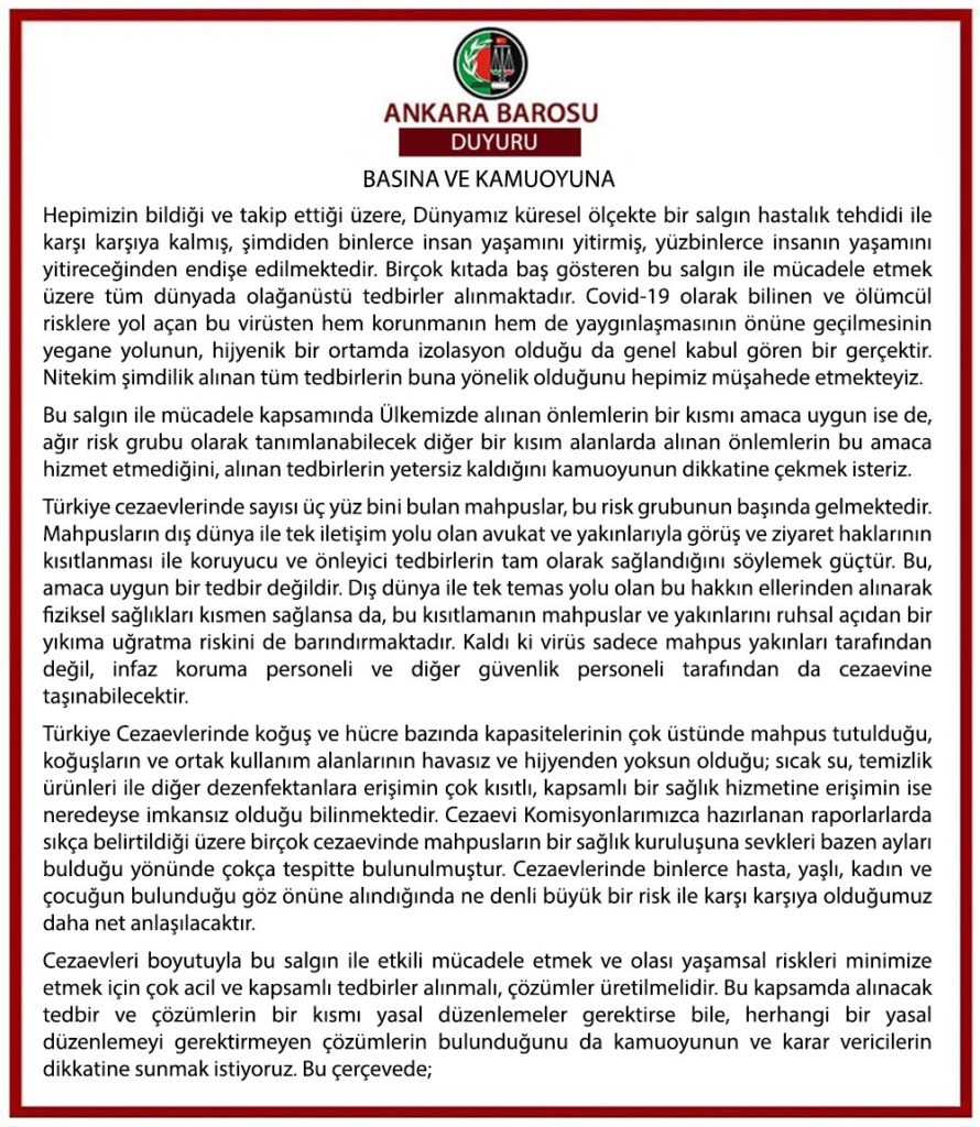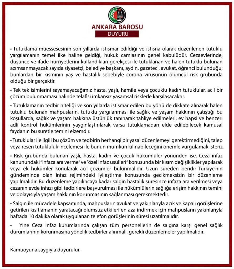 Yasal düzenleme çağrısı yapan 33 baro, “Salgın hastalık süresince infaza ara verilmesi veya cezanın evde infazı gibi tedbirlere başvurulması” gerektiğini ifade etti.Tutukluların avukat ve aile görüşmelerinin kısıtlanmasının salgın tehdidinin önüne geçmeyeceği belirtilen barolar, başta hasta tutuklular olmak üzere tüm tutuklular için gerekirse yasal düzenleme yapılarak tahliyelerinin sağlanması çağrısında bulunuldu.Açıklamada Koronavirüs tehdidi altında olan cezaevlerindeki tutuklularla ilgili yasal düzenleme yapılana kadar infaza ara verilmesi veya cezanın evde infazı gibi tedbirlere başvurulmasının tedbir olarak uygulanması gerektiği vurgulandı.