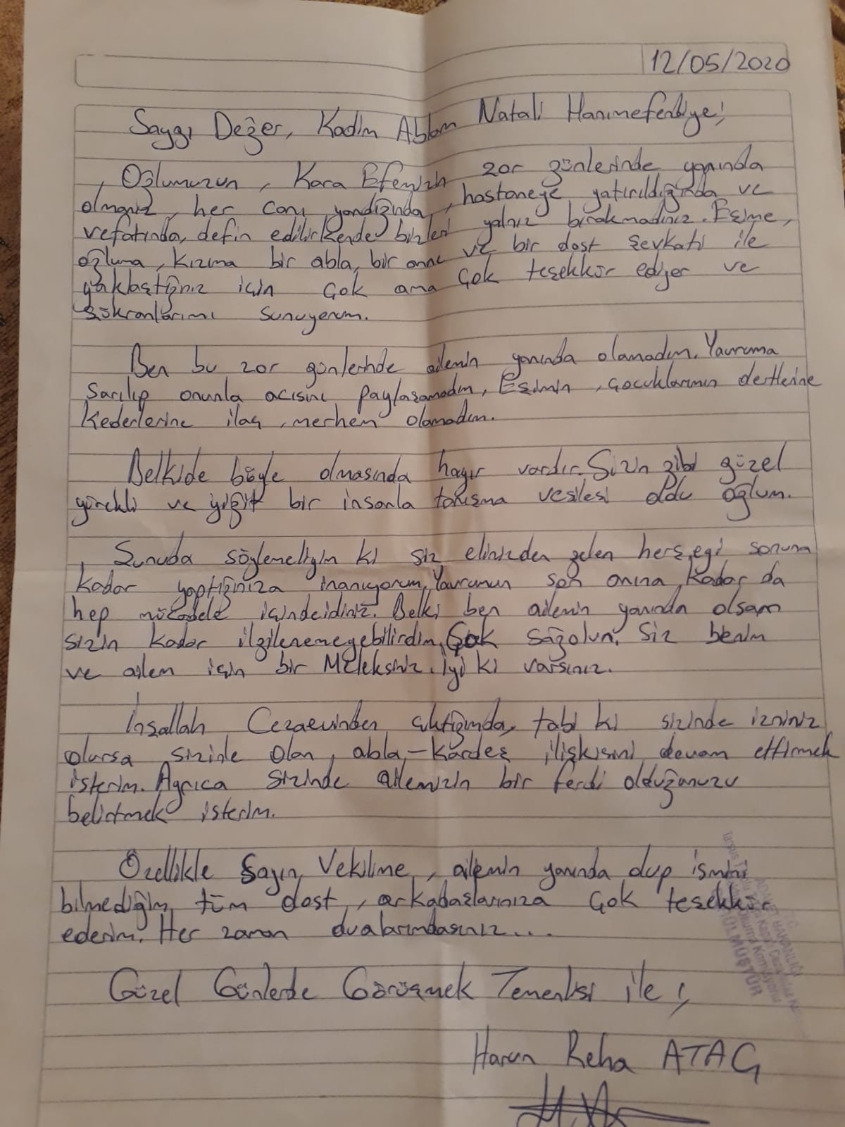 Şunu da söylemeliyim ki sizin elinizden gelen her şeyi sonuna kadar yaptığınıza inanıyorum. Yavrumun son anına kadar da hep mücadele içindeydiniz. Belki ben ailemin yanında olsam sizin kadar ilgilenemeyebilirdim. Çok sağ olun, siz benim ve ailem için bir meleksiniz. İyi ki varsınız.İnşallah cezaevinden çıktığımda, tabii ki sizin de izniniz olursa sizinle olan abla-kardeş ilişkisini devam ettirmek isterim. Ayrıca sizin de ailemizin bir parçası olduğunuzu belirtmek isterim.Özellikle sayın vekilime, ailemin yanında olup ismini bilmediğim tüm dost, arkadaşlarınıza çok teşekkür ederim. Her zaman dualarımdasınız…Güzel günlerde görüşmek temennisi ile Harun Reha Ataç”