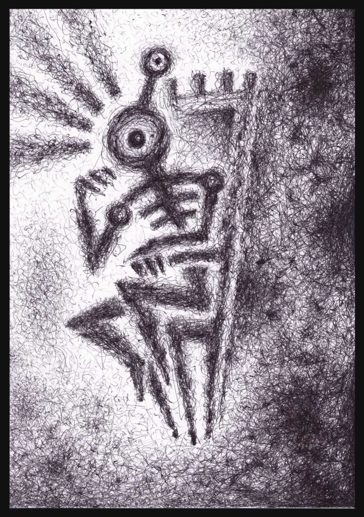 “Ben kendimin ele geçirilmesine izin verdim; durmaksızın çiziyorum. “Esinlenme X” çizimi benim için takıntı haline geldi, yanıyorum. Bu ipince, fazla ince, tükenmez kalem beni mahvediyor. Bitirmesi 2-3 gün süren çizim şimdi ikinci haftasında, hala bitmemiş. Her yer acıyor; tek düşündüğüm şey o. Bu bir hapis hikayesi. Başka bir zaman anlatırım.” —Yazıcı, bu eseri 2019’da hapishane hücresinde gerçekleştirdi.