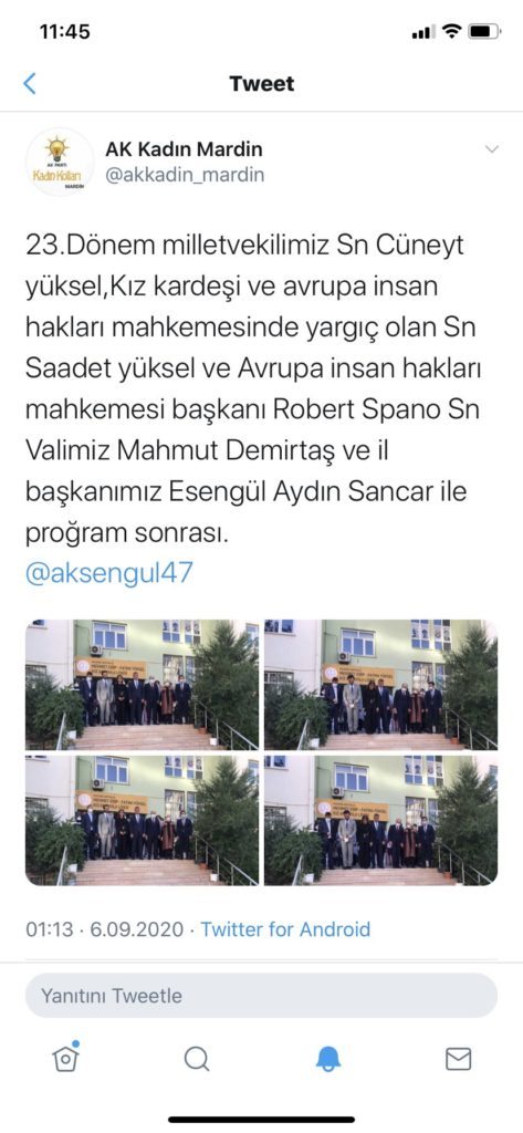 Mardin Valiliği ve Mardin Barosu’nu da ziyaret eden Spano’nun programının tamamında, AKP’liler de eşlik etti.AKP Kadın Kolları Başkanlığı sosyal medya hesabından yapılan paylaşımda, Spano ile program sonrası çekilen fotoğraflara yer verildi. Paylaşımda şu ifadelere yer verildi: “23. Dönem milletvekilimiz Sn Cüneyt yüksel, Kız kardeşi ve Avrupa insan hakları mahkemesinde yargıç olan Sn Saadet yüksel ve Avrupa insan hakları mahkemesi başkanı Robert Spano Sn Valimiz Mahmut Demirtaş ve il başkanımız Esengül Aydın Sancar ile proğram sonrası.”