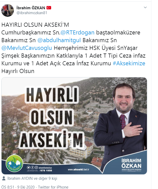 AKP’li Akseki Belediye Başkanı İbrahim Özkan, sosyal medya hesabından Akseki’de yapımı tamamlanan iki cezaevini için AKP’li Cumhurbaşkanı Erdoğan, Adalet Bakanı Abdülhamit Gül, Dışişleri Bakanı Mevlüt Çavuşoğlu ve HSK Üyesi Yaşar Şimşek’e katkılarından dolayı teşekkür etti. İki cezaevinin Akseki için hayırlı olmasını dileyen İbrahim Özkan twitter hesabından yaptığı paylaşımda şu ifadeleri kullandı: