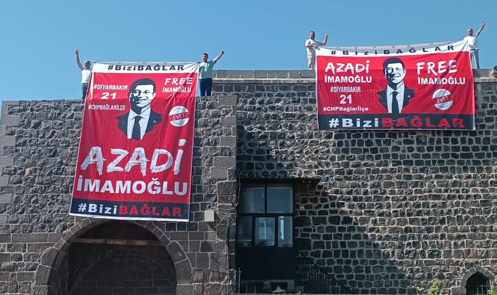 CHP’nin cumhurbaşkanı adayı Ekrem İmamoğlu için Diyarbakır surlarına asılan “Azadi İmamoğlu” ve “Free İmamoğlu” pankartlarına polis tarafından el konuldu. Pankartı asanlar da gözaltına alındı.