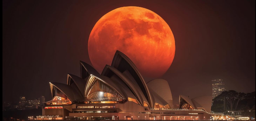 Ay, tamamen kırmızı rengini almasa da bakır-kızıl tonlarına büründüğü gözlendi. Fotoğrafçı Ethan Callaghan, Avustralya’nın turizm ve liman şehri, Sydney semalarında gerçekleşen tam ay tutulması sırasında yükselen Kızıl Dolunay’ı nefes kesici bir kareyle adeta ölümsüzleştirdi.Görüntü, “telefoto sıkıştırma (lens compression)” adı verilen özel bir teknikle çekildiği belirtildi.