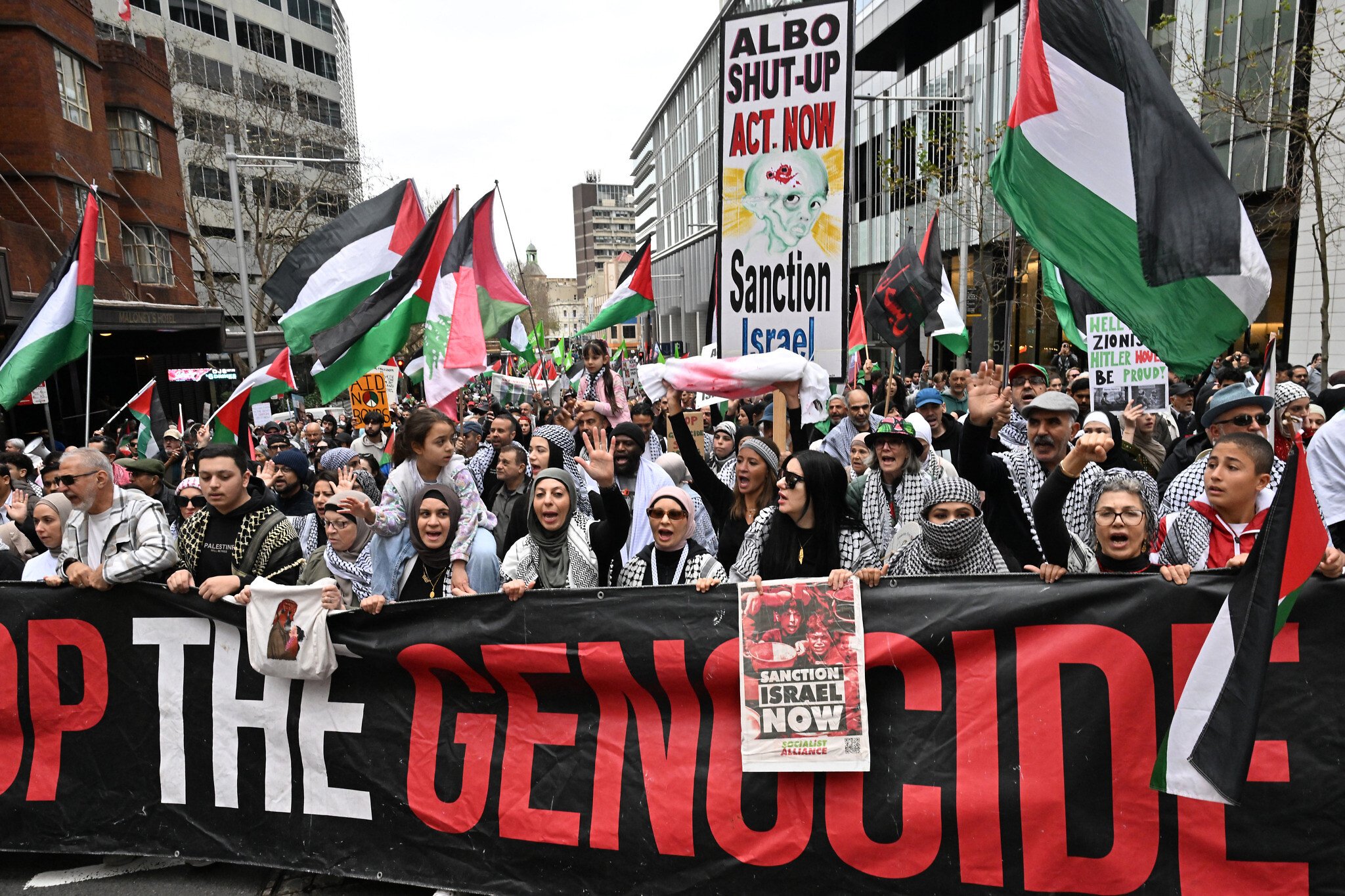 Sydney’deki miting ise; şehrin kalbinde insanlar ellerinde Filistin bayraklarıyla toplandı. Gözlerinde hüznü, dudaklarında duaları taşıyan katılımcılar, “Özgür Filistin”, “Dur De” sloganlarıyla yürüdü. Polis barikatlarına rağmen protestocular yürürken, zaman zaman kısa süreli gerginlikler yaşandı.