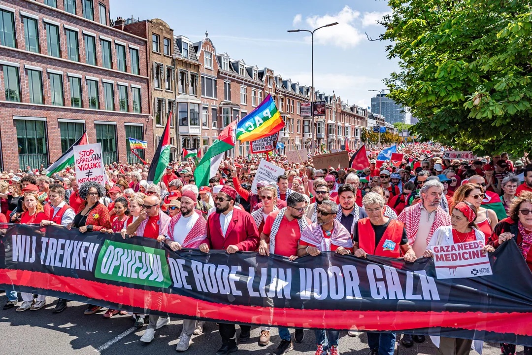 Göstericiler, kırmızı kıyafetlerle Gazze’deki soykırımın durdurulması ve Hollanda hükümetinin İsrail’e karşı net bir tavır alması çağrısında bulundu. Organizasyona göre katılım, daha önce Lahey’de yapılan iki yürüyüşün (100 bin ve 150 bin kişi) çok üzerinde gerçekleşti.