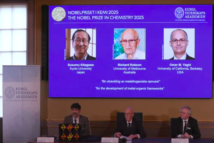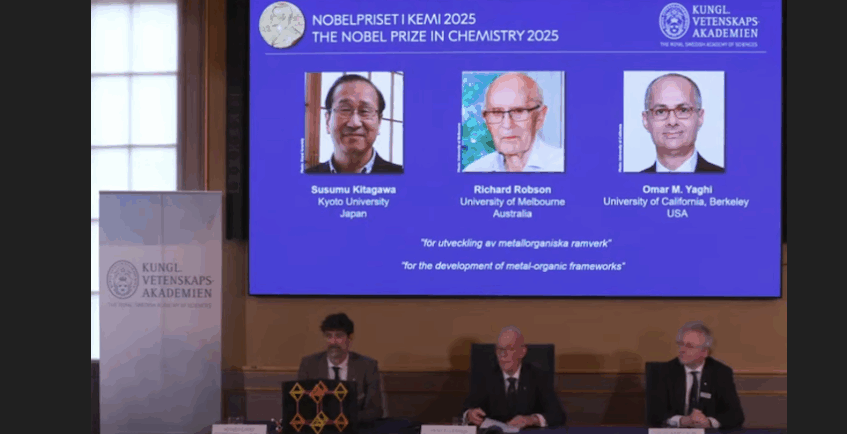 2025 yılı Nobel Kimya Ödülü, metal-organik iskeletler (MOF) üzerine yaptıkları öncü çalışmalar nedeniyle Susumu Kitagawa, Richard Robson ve Omar M. Yaghi’ye verildi.