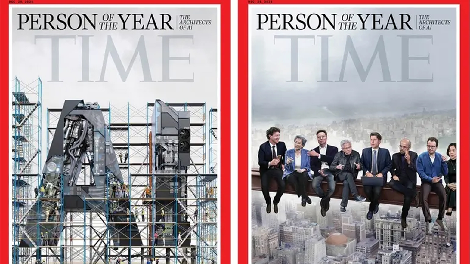 Time’ın bu yılki özel sayısında yer alan iki farklı kapaktan birinde, teknoloji dünyasının önde gelen isimleri Mark Zuckerberg (Meta), Elon Musk (xAI/Tesla), Jensen Huang (NVIDIA), Sam Altman (OpenAI), Demis Hassabis (DeepMind), Lisa Su (AMD), Dario Amodei (Anthropic) ve Fei-Fei Li (Stanford Üniversitesi) birlikte yer aldı.