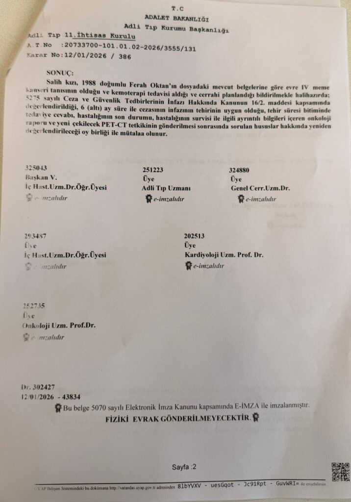 Ancak dosyası Yargıtay’da bulunan Oktan henüz tahliye edilmedi.12 Ocak 2026 tarihli raporda, Salih kızı, 1988 doğumlu Ferah Oktan’ın dosyadaki mevcut belgelere göre evre IV meme kanseri tanısı aldığı, kemoterapi tedavisi gördüğü ve cerrahi müdahalenin planlandığı belirtildi. Raporda, Oktan’ın 5275 sayılı Ceza ve Güvenlik Tedbirlerinin İnfazı Hakkında Kanunun 16/2. maddesi kapsamında değerlendirilmediği, bu nedenle 6 ay süreyle cezasının infazının ertelenmesinin uygun olduğu ifade edildi.