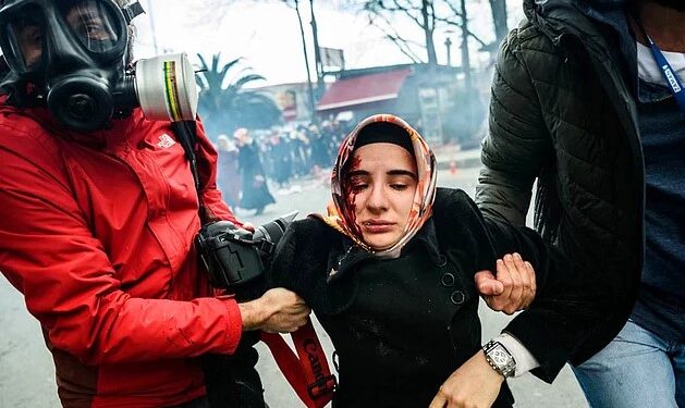 Bu fotoğraf 5 Mart 2016’da KHK ile kapatılan Zaman Gazetesinin Yenibosna’daki ana binasının önünde foto muhabiri Kürşat Bayhan tarafından çekildi. 4 Mart 2016’da devlet tarafından el konulan ve kayyım atanan Zaman Gazetesine o günlerde okurları da sahip çıkmış, genç, yaşlı birçok kadın çocuklarını da yanlarına alarak bu kararı protesto etmek için toplanmıştı. Saat öğlen civarlarıydı. Toplanan kalabalığı polis su sıkarak, gaz bombası atarak dağıttı. Kadınlar yerlerde sürüklendi. O gün yaralanan ve yüzünde gaz maskerleriyle görevini yapmaya çalışan foto muhabirleri tarafından taşınan bu genç kızın hala yaşadığı travmayı atlatamadığı biliniyor. Havuz medyasının başörtülü gazetecilerinden Esra Elönü bu fotoğrafa bakıp “Başı tokasıyla yaralanmış” diyebilmişti.