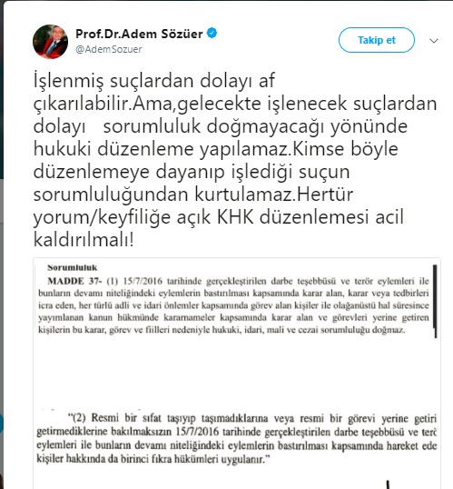 Twitter hesabından bu konuda paylaşımda bulunan Sözüer, “İşlenmiş suçlardan dolayı af çıkarılabilir. Ama, gelecekte işlenecek suçlardan dolayı sorumluluk doğmayacağı yönünde hukuki düzenleme yapılamaz. Kimse böyle düzenlemeye dayanıp işlediği suçun sorumluluğundan kurtulamaz. Her tür yorum/keyfiliğe açık. KHK düzenlemesi acil kaldırılmalı!” ifadelerini kullandı.
