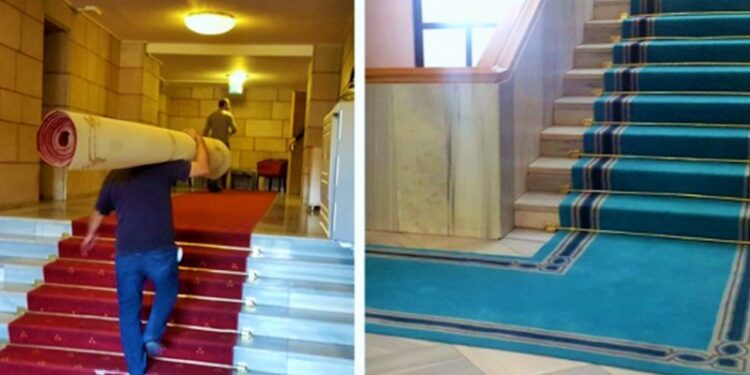 Meclis’in kırmızı halılarının yerine yüzde 100 yün turkuaz halılar serildi.