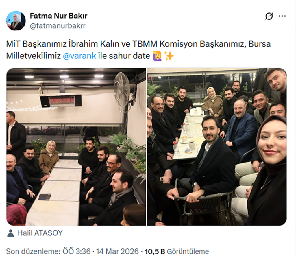 irçok gazeteciye ‘MİT personelini ifşa etmekten’ soruşturma açılırken, Ankara’da AKP’lilerin düzenlediği sahur programında MİT mensuplarının yüzleri açık şekilde fotoğraflanarak, bu fotoğrafların sosyal medyada paylaşıldığı görüldü.AKP Ankara Gençlik Kolları İl Başkan Yardımcısı Fatma Nur Bakır, X hesabından MİT Başkanı İbrahim Kalın ile eski Bakan Mustafa Varank’ın olduğu fotoğrafları paylaşarak, “MİT Başkanımız İbrahim Kalın ve TBMM Komisyon Başkanımız, Bursa Milletvekilimiz @varank ile sahur date” diye yazdı.