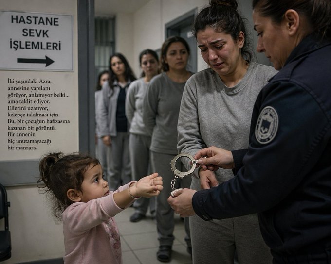 “Bu gördüğünüz gerçekten yaşandı. Sincan Kadın Cezaevi’nde görüştüğüm Emine Sarıoğlu, 2 yaşındaki kızı Azra’nın, hastaneye götürülen kadınlara kelepçe takıldığını görünce elini uzatarak kendisine de takılmasını beklediğini anlattı. Anne, bu anıyı en acı hatıralarından biri olarak ifade etti.”