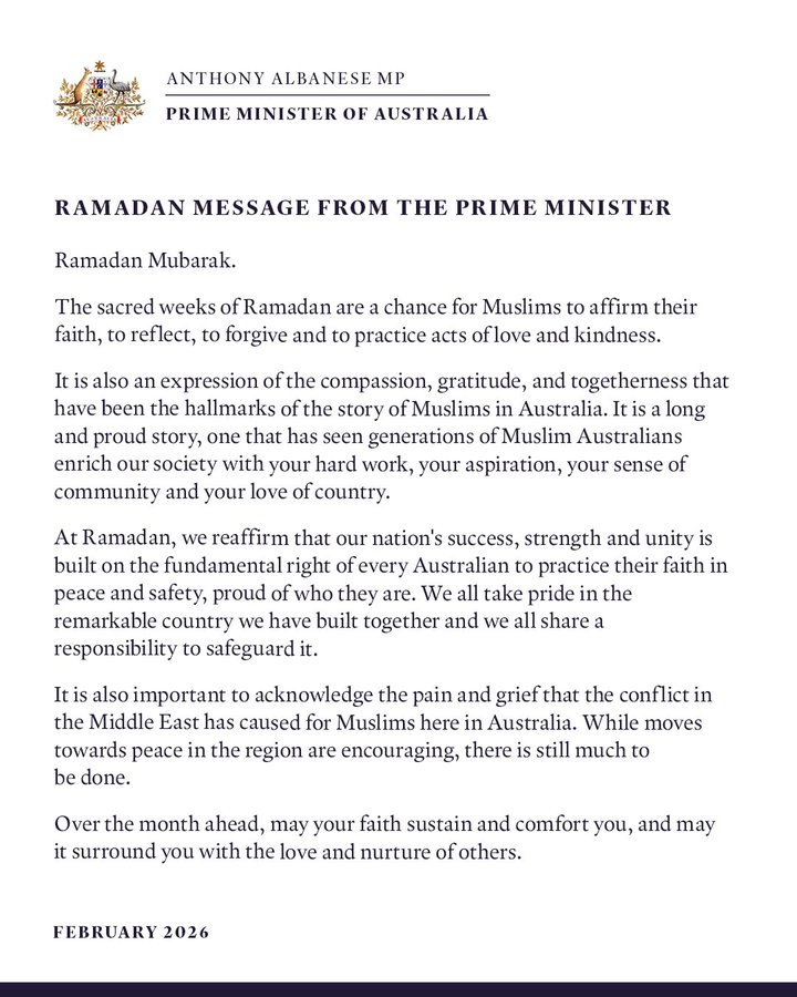 Başbakan Anthony Albanese, mesajında Müslüman toplumun inanç özgürlüğü içinde ibadet edebilmesinin ülkenin temel değerlerinden biri olduğunu vurguladı. Ramazan’ın tefekkür, affetme ve iyilik ayı olduğuna işaret eden Albanese, Müslüman Avustralyalıların toplumsal hayata sunduğu katkıları öne çıkardı.