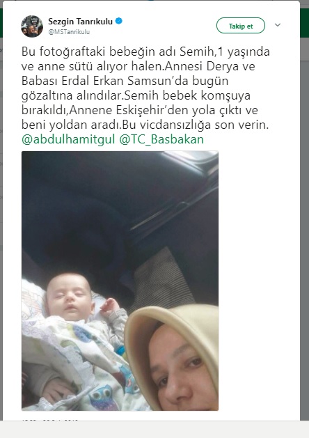 Duruma sosyal medya hesabından tepki gösteren CHP Milletvekili Sezgin Tanrıkulu, “Bu fotoğraftaki bebeğin adı Semih,1 yaşında ve anne sütü alıyor halen. Annesi Derya ve Babası Erdal Erkan Samsun’da bugün gözaltına alındılar. Semih bebek komşuya bırakıldı,Annene Eskişehir’den yola çıktı ve beni yoldan aradı. Bu vicdansızlığa son verin.” dedi.
