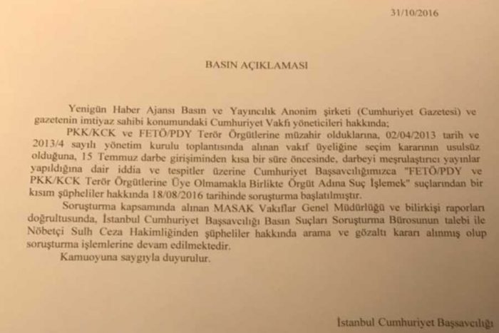 Cumhuriyet gazetesine ve yöneticilerine yönelik operasyon başlatıldı. Polis, Genel Yayın Yönetmeni Murat Sabuncu, İcra Kurulu Başkanı Akın Atalay ve Yazar Güray Öz’ün evini bastı. Hikmet Çetinkaya, Musa Kart, Mustafa Güngör’ün evleri aranıyor.Murat Sabuncu ve Güray Öz gözaltına alındı. Akın Atalay yurtdışında olduğu için sadece evinde arama yapıldı.İktidarın yayın organları Sabah ve Y.Şafak, 15 gazeteci hakkında gözaltı kararı bulunduğunu, Orhan Erinç yaşlı olduğu için bu işlemin uygulanmadığını yazdı.