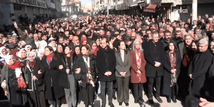 DEM Parti haftalık Meclis grup toplantısını, Suriye’de devam eden çatışmalara dikkat çekmek için Suriye sınırındaki Nusaybin’de yapıyor. Toplantı öncesi DEM Partili vekiller ve halk yürüyüş gerçekleştiriyor.