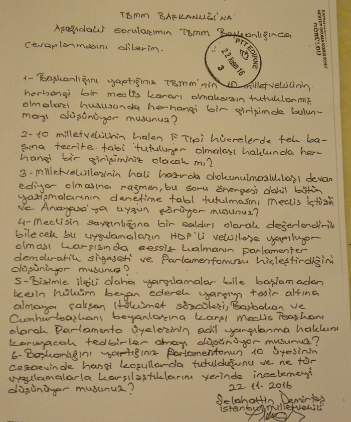 HDP Eş Genel Başkanı Selahattin Demirtaş, “Bizimle ilgili daha yargılamalar bile başlamadan kesin hüküm beyan ederek yargıyı tesir altına almaya çalışan Hükümet sözcüleri, Başbakan ve Cumhurbaşkanı beyanlarına karşı meclis başkanı olarak parlamentoya verilen adil yargılanma hakkını koruyacak tedbirler almayı düşünüyor musunuz? Başkanlığını yaptığınız parlamentonun 10 üyesinin cezaevinde hangi koşullarda tutulduğunu ve ne tür uygulamalarla karşılaştıklarını yerinde incelemeyi düşünüyor musunuz?” sorularını sordu.