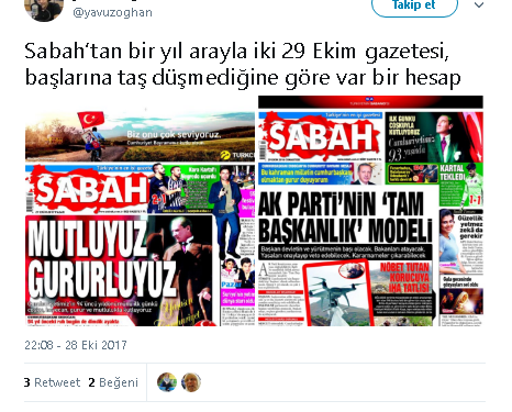 Gazeteci Yavuz Oğhan bu farkı kişisel Twitter adresinden paylaştığı bir mesajla, şöyle gördü:”Sabah’tan bir yıl arayla iki 29 Ekim gazetesi, başlarına taş düşmediğine göre var bir hesap”