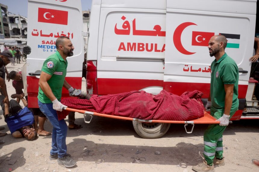 EDITORS NOTE: Graphic content / Medics carry casualties of reported Israeli strikes on members of aid security committees set up by volunteers from prominent Palestinian families to prevent aid theft, in the Saftawi neighborhood west of Jabalia in the northern Gaza Strip on August 13, 2025. The Israeli military said it had approved the framework for a new offensive in the Gaza Strip, days after Israel's security cabinet called for the seizure of Gaza's largest city, following 22 months of war that have created dire humanitarian conditions in the Palestinian territory. (Photo by Bashar TALEB / AFP)