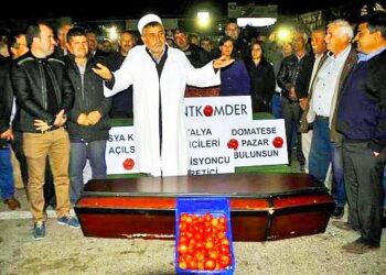Antalya’da domates ihracının önündeki engellerin kaldırılmasını isteyen üreticiler, içinde domates bulunan tabut önünde temsili cenaze namazı kıldı.Kumluca, Finike, Elmalı, Aksu,...
