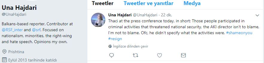 Una Hajdari: Basın toplantısında konuşan Taçi kısaca bu insanların Ulusal Güvenliğe tehdit olduğunu kriminal aktiviteler içine girdiğini, AKI direktörü (İstihbarat kurumu) ve bundan dolayı kendisinin suçlanamayacağını söyledi. Ama bu aktivitelerin ne olduğunu söylemedi. #KendinenUtan #İstifaet
