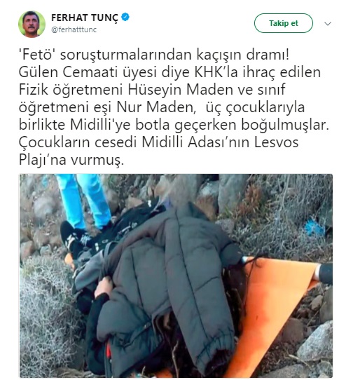 Sanatçı Ferhat Tunç ise, “Gülen Cemaati üyesi diye KHK’la ihraç edilen Fizik öğretmeni Hüseyin Maden ve sınıf öğretmeni eşi Nur Maden, üç çocuklarıyla birlikte Midilli’ye botla geçerken boğulmuşlar. Çocukların cesedi Midilli Adası’nın Lesvos Plajı’na vurmuş.” dedi.