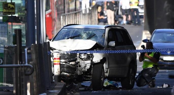 Melbourne kentindeki Flinders Caddesi’nde, yayaların üzerine aracını sürerek