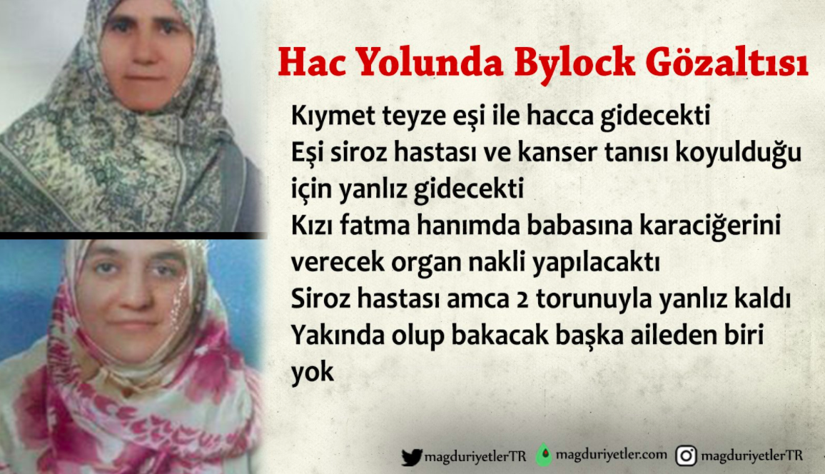 İzmir’de yaşayan 70 yaşındaki Kıymet Teyze hac yolculuğu yapacağı sırada havalimanında Bylock kullandığı gerekçesiyle kızı ile beraber gözaltına alındı.Kıymet Teyze yıllardır hayalini yaşadığı hac yolculuğuna eşinin ağır siroz ve kanser hastası olduğu için kızıyla çıkmak istemişti. Hasta olan eşinin yanında da refakatçı 2 torunu kalacaktı. Kıymet teyze ve kızı gözaltına alınarak hem hac yolculukları engellendi, hem de şu an ağır hasta olan eşi yapayalnız kaldı.