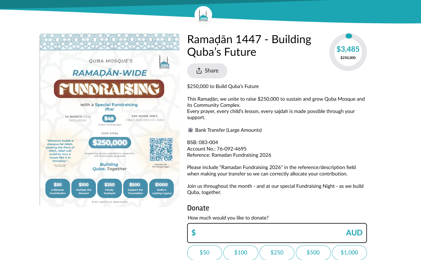 Selimiye Vakfı bünyesinde Melbourne’un Craigieburn bölgesinde yükselen Quba Camii, Ramazan ayında hem iftar hem de bağış (donation) gecesi düzenleyerek caminin faaliyetlerini güçlendirmek için 250 bin dolar bağış hedefi belirledi. Caminin imamı ve ilahiyatçı İbrahim Karaisli, “Bu cami sadece bir bina değil; gönülleri birleştiren, gençleri Kur’an’la buluşturan bir rahmet kapısıdır.” dedi.