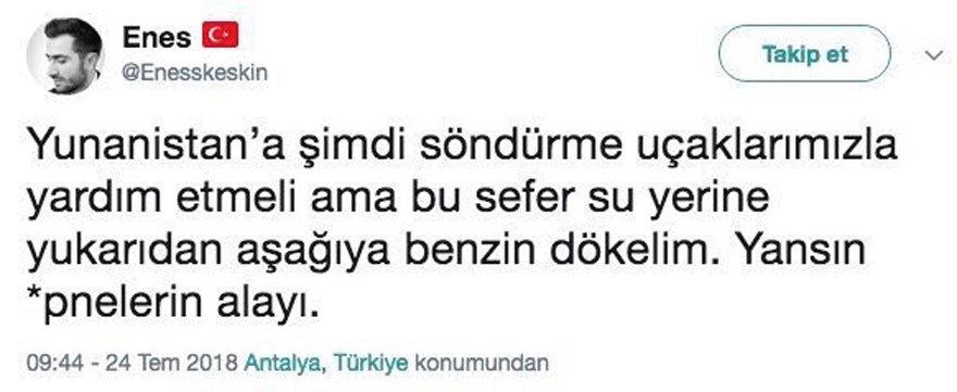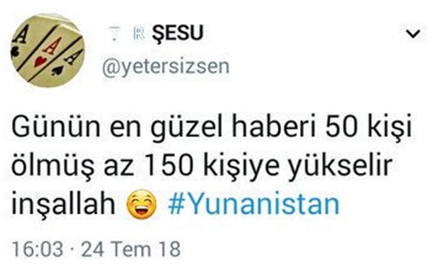 Bu vurdumduymazlığa sosyal medya hesaplarından katılanlar da oldu. Bazı hesaplar yangına ve Yunanistan’ın acı kayıplarına sevindi. ‘İnsanlık bazıları için ölmüş’ dedirten yorumlar yazdı. Tepki çeken yorumlar arasında ‘Yunanistan cayır cayır yanıyor, ateşleri bol olsun’ ‘Günün en güzel haberi 50 kişi ölmüş, 150’ye yükselir inşallah’ gibi yazılar yer aldı.