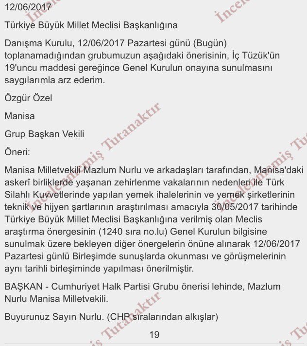 Yemek firmasının araştırılması için verilen ama kabul edilmeyen önerge