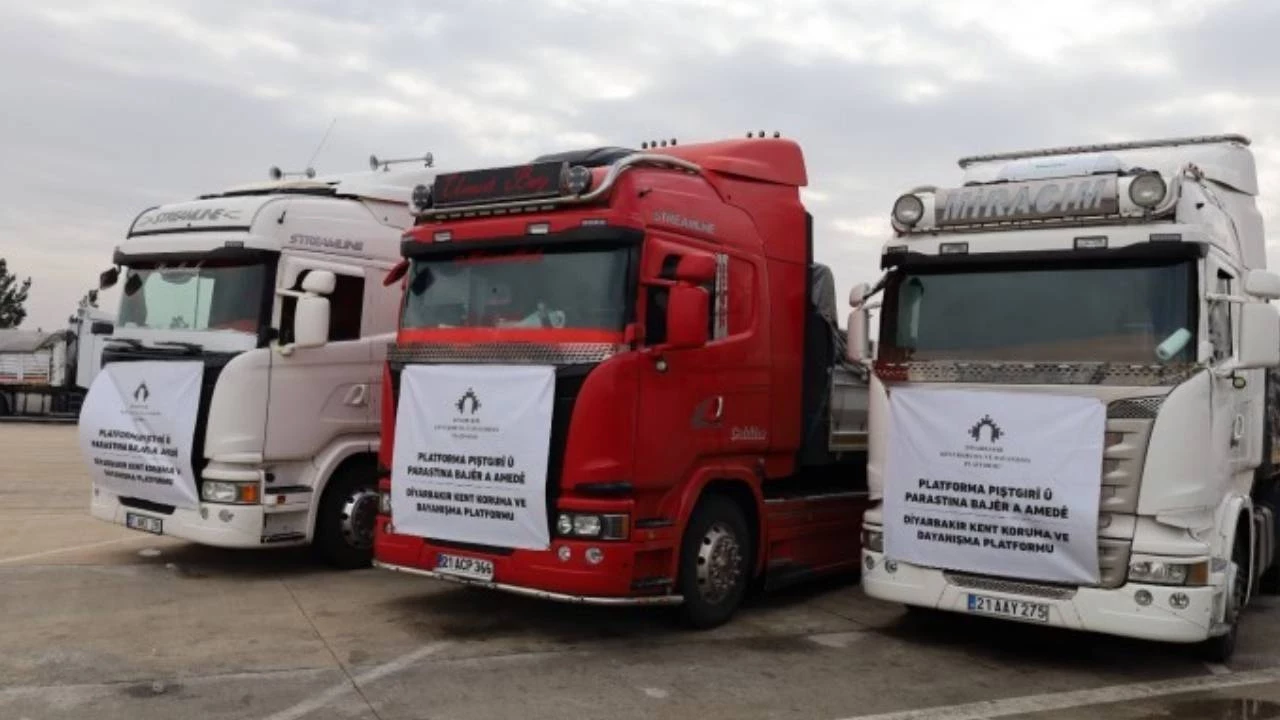 Battaniye, su, bebek maması, çocuklar için süt, çocuk bezi, kışlık kıyafet, gıda ve temel yaşam malzemelerini içeren yardımları taşıyan TIR’lar Kobani’ye 10 kilometrelik mesafede olan bir dinlenme tesisinde etrafları bariyerlerle kapatılmış durumda.